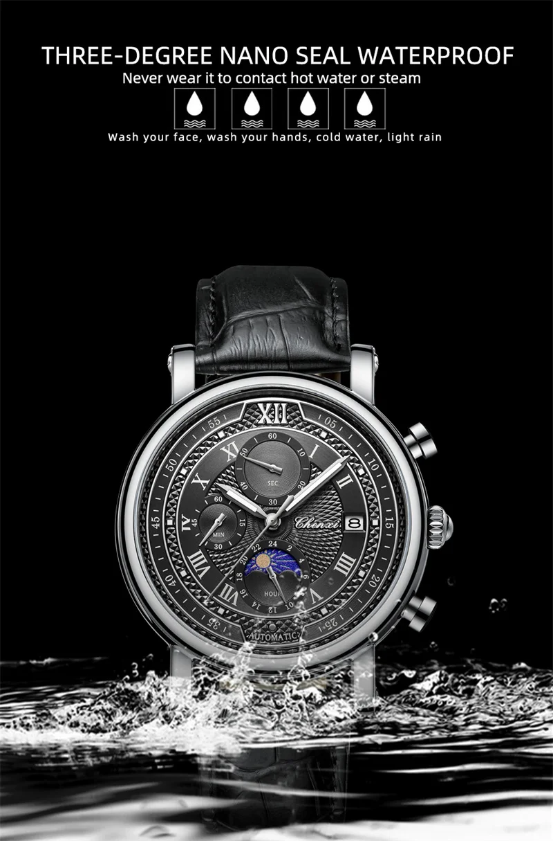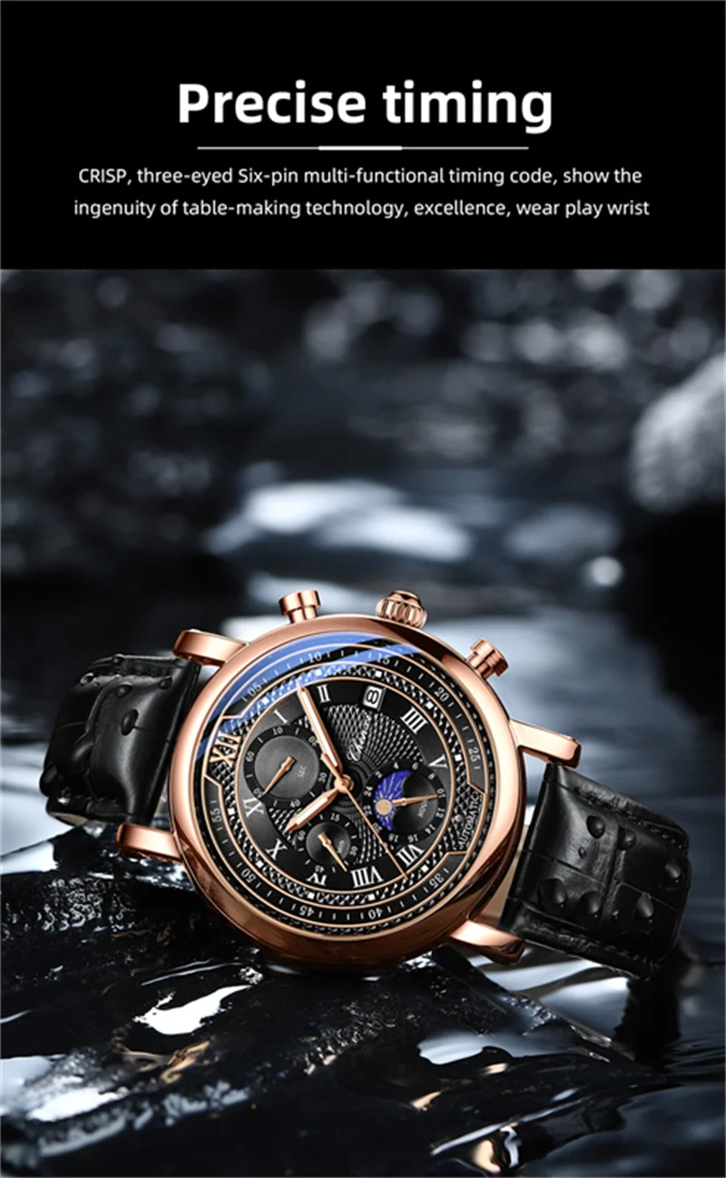 Feature: Stop Watch,Shock Resistant,Luminous,Auto Date,Chronograph,Complete Calendar,Moon Phase,Water-Resistance,Luminous Hands