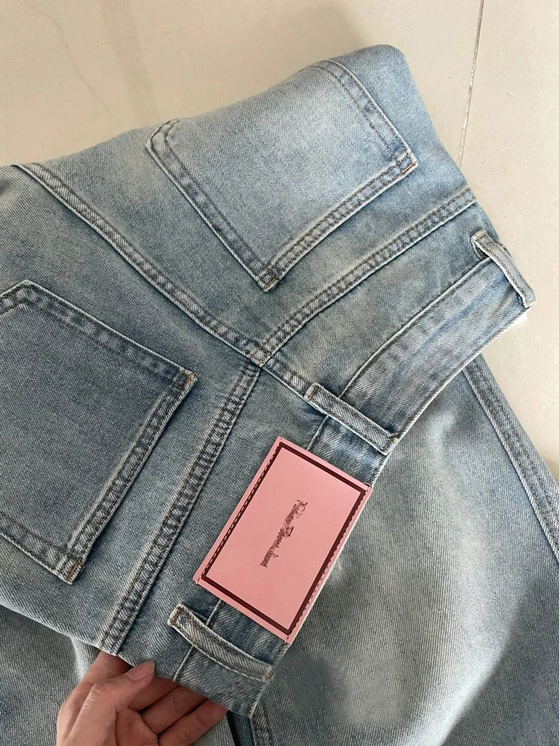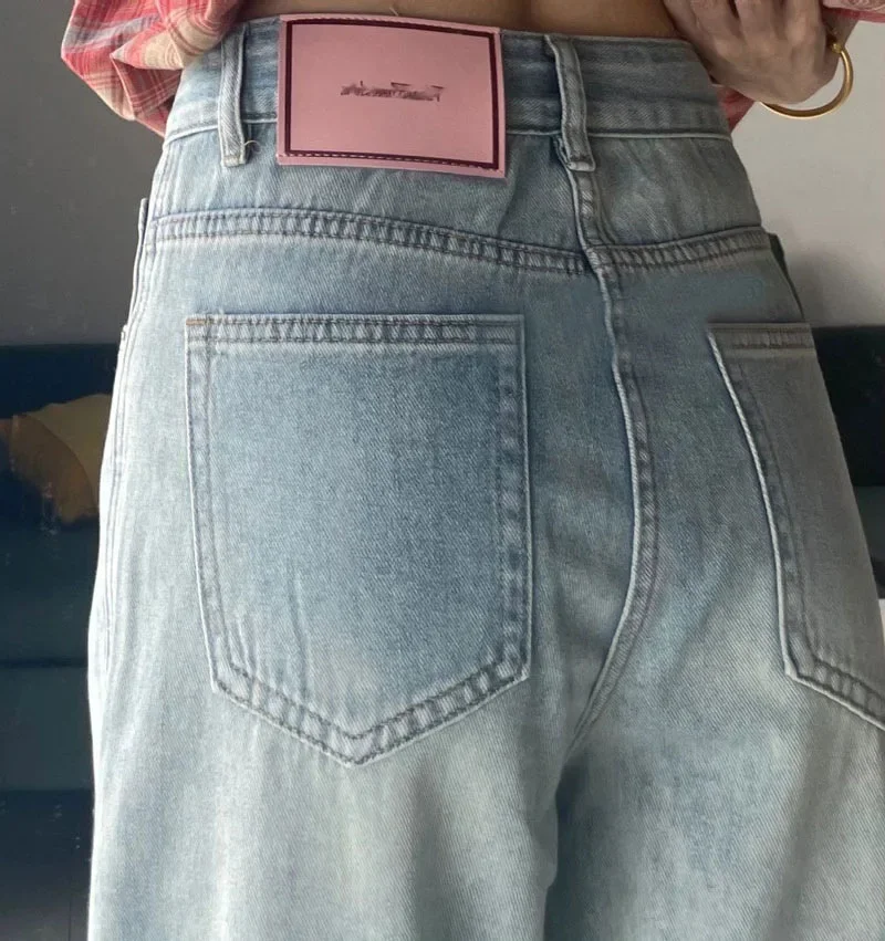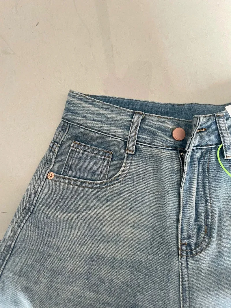 Denim Pant Women Jeans Basics Full Length Straight Wide Leg Pants High Waist Pockets Button Solid Vintage Trousers Casual Denims
