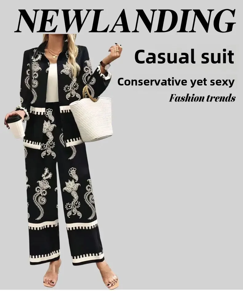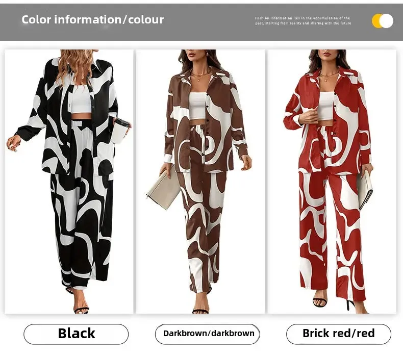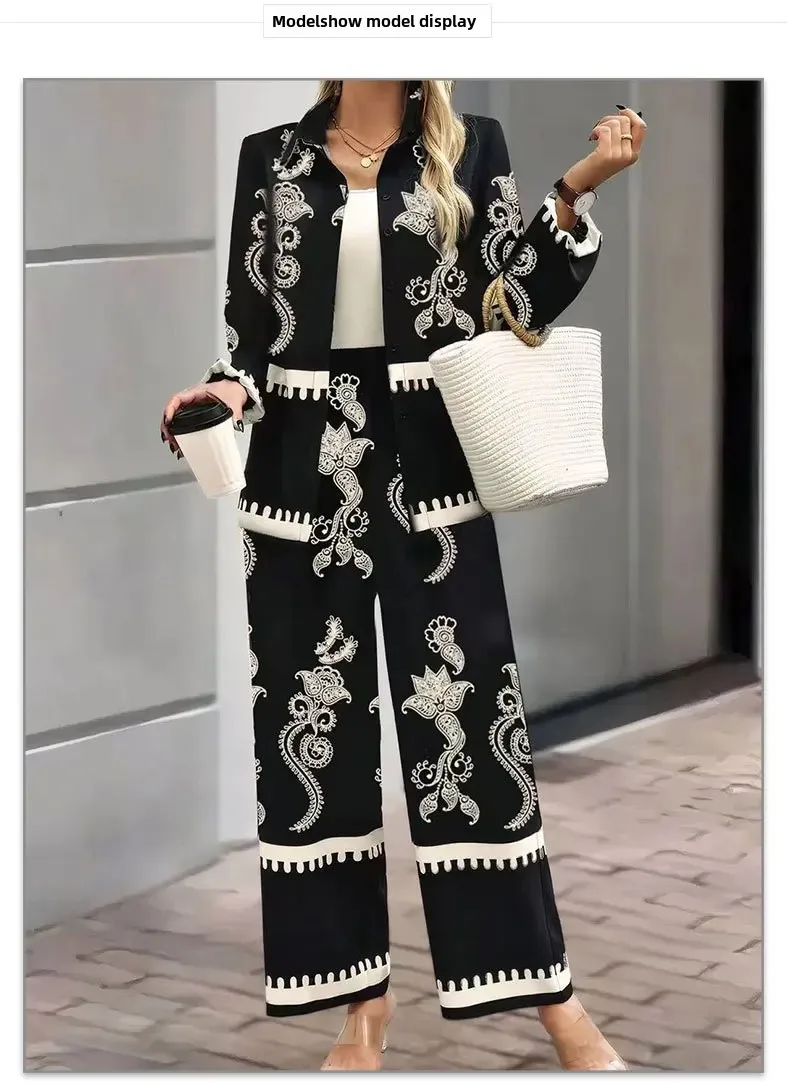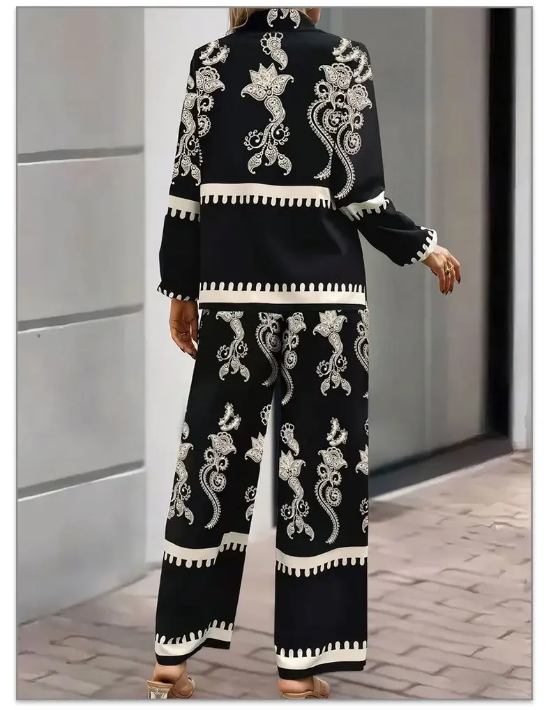 Fashionable Contrast Color Print Blouse And Pants Two-Piece Set for Women Stylish Retro Personality Elegant Office Wear