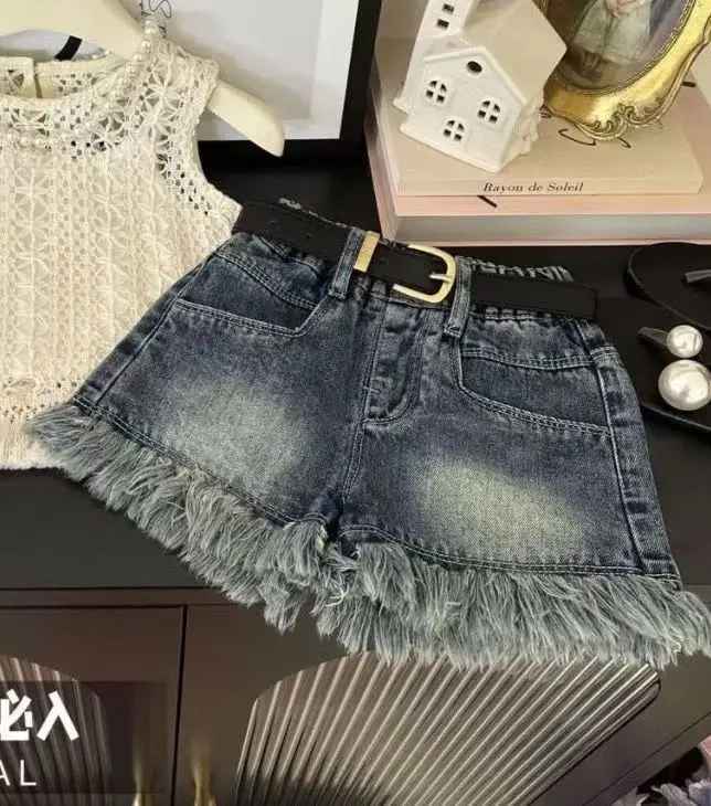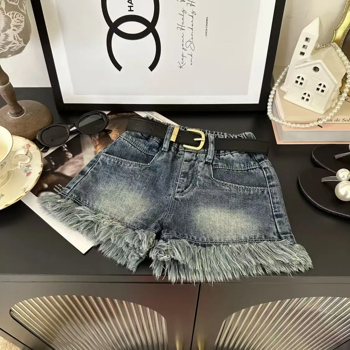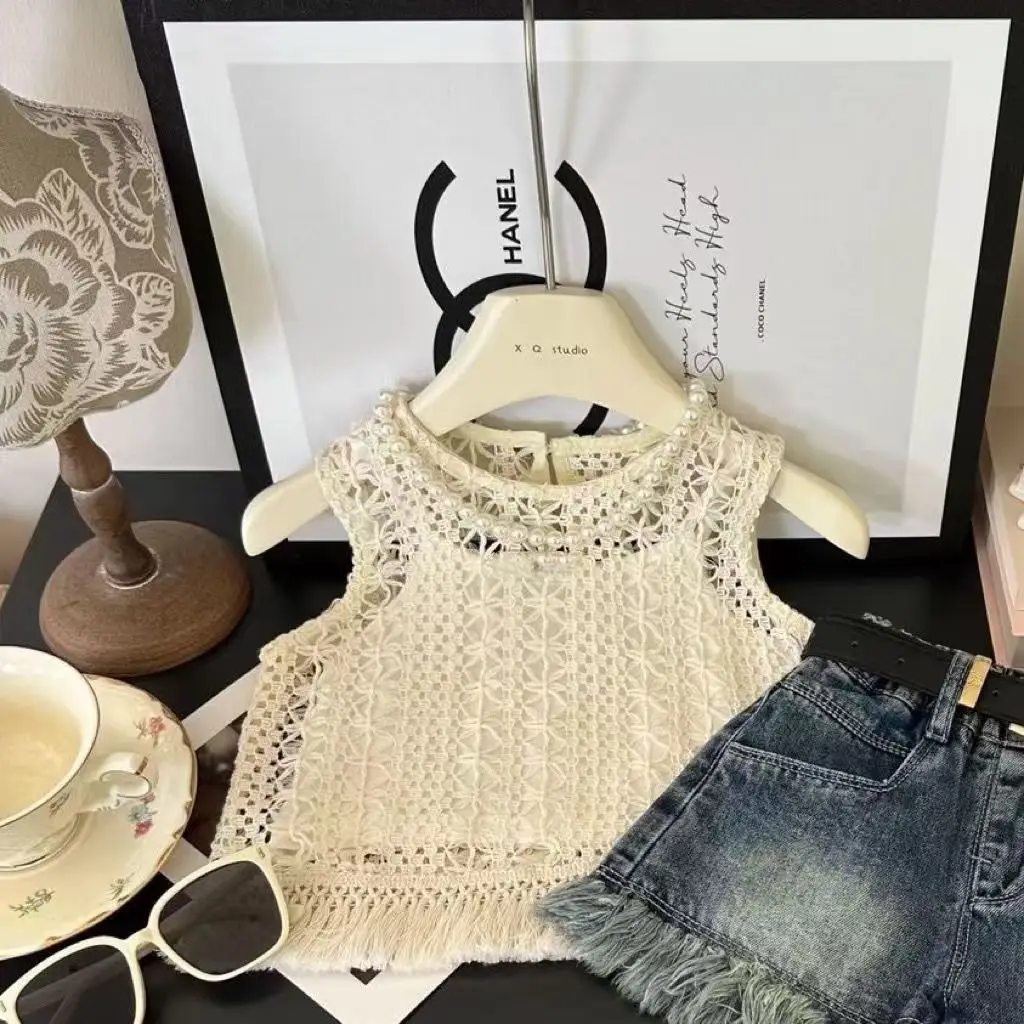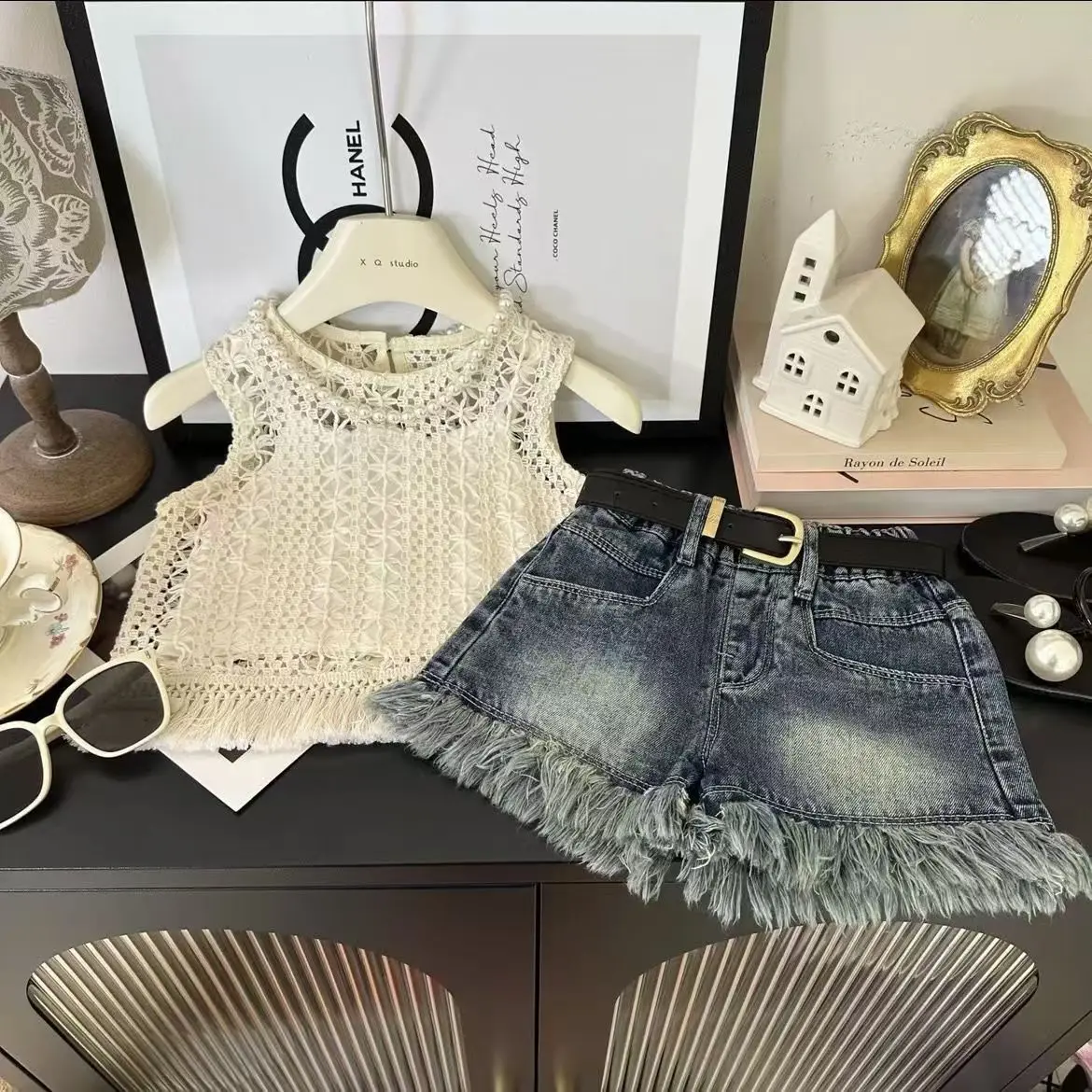 Girls' Summer Collection 2025 New Style Baby Girl Fashion Knitted Strap Top Cowboy Shorts 3-Piece Set Children's Clothing