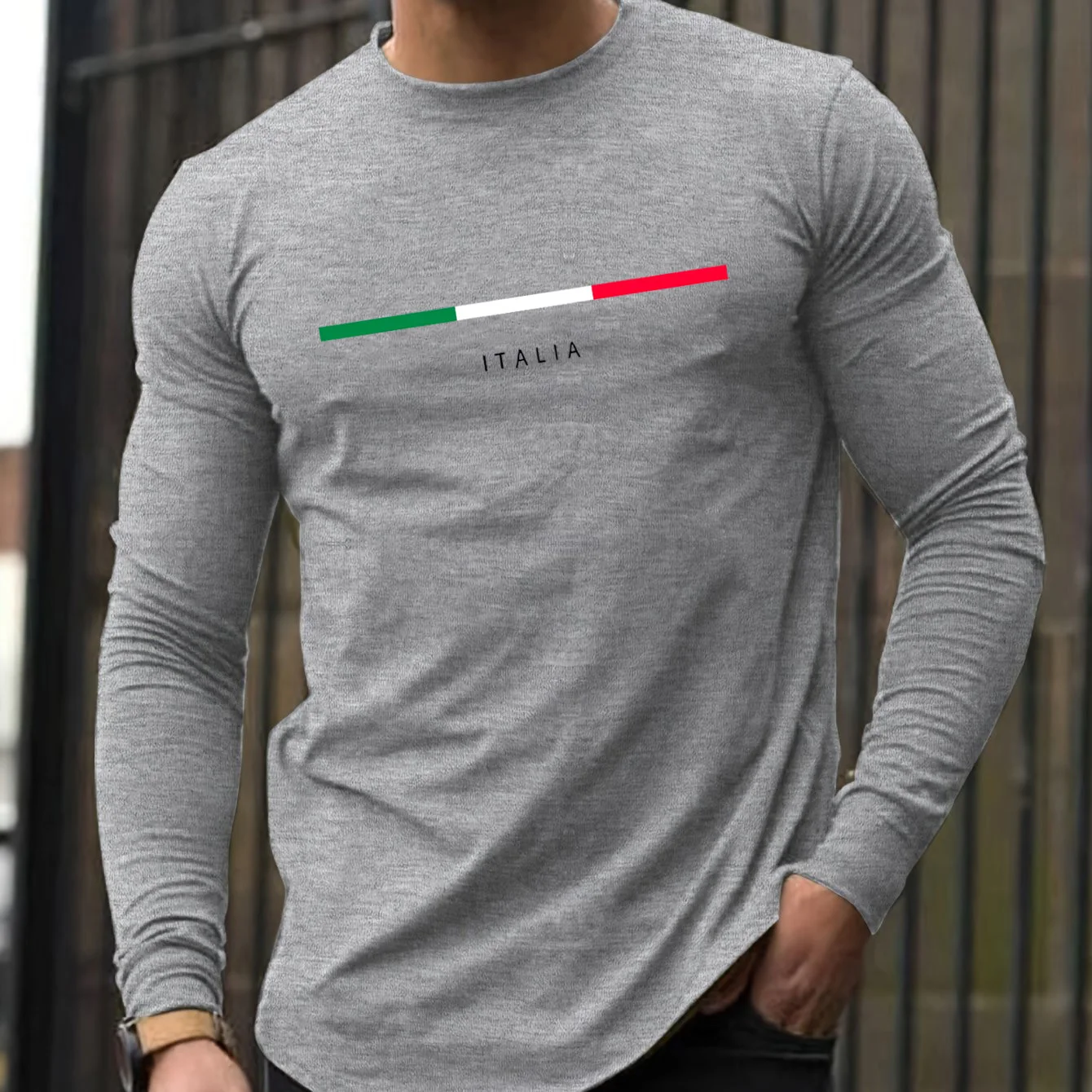 Men's Spring and Autumn 100% Cotton Loose Comfortable Casual ITALIA Letter Pattern Printed Round Neck Long Sleeve T-shirt