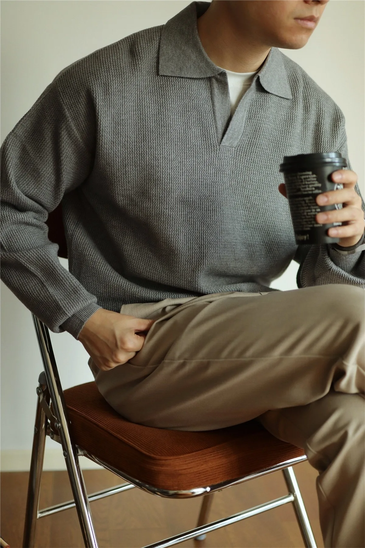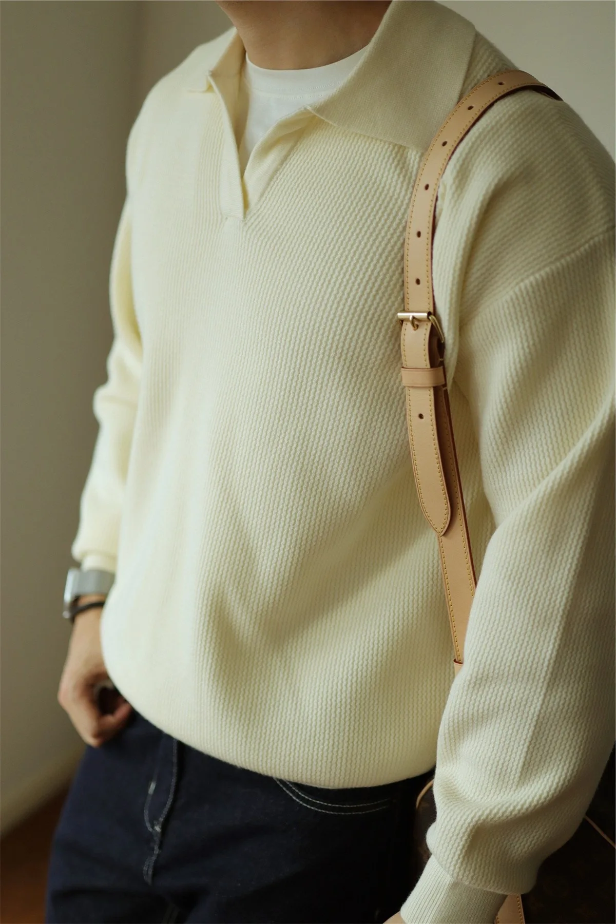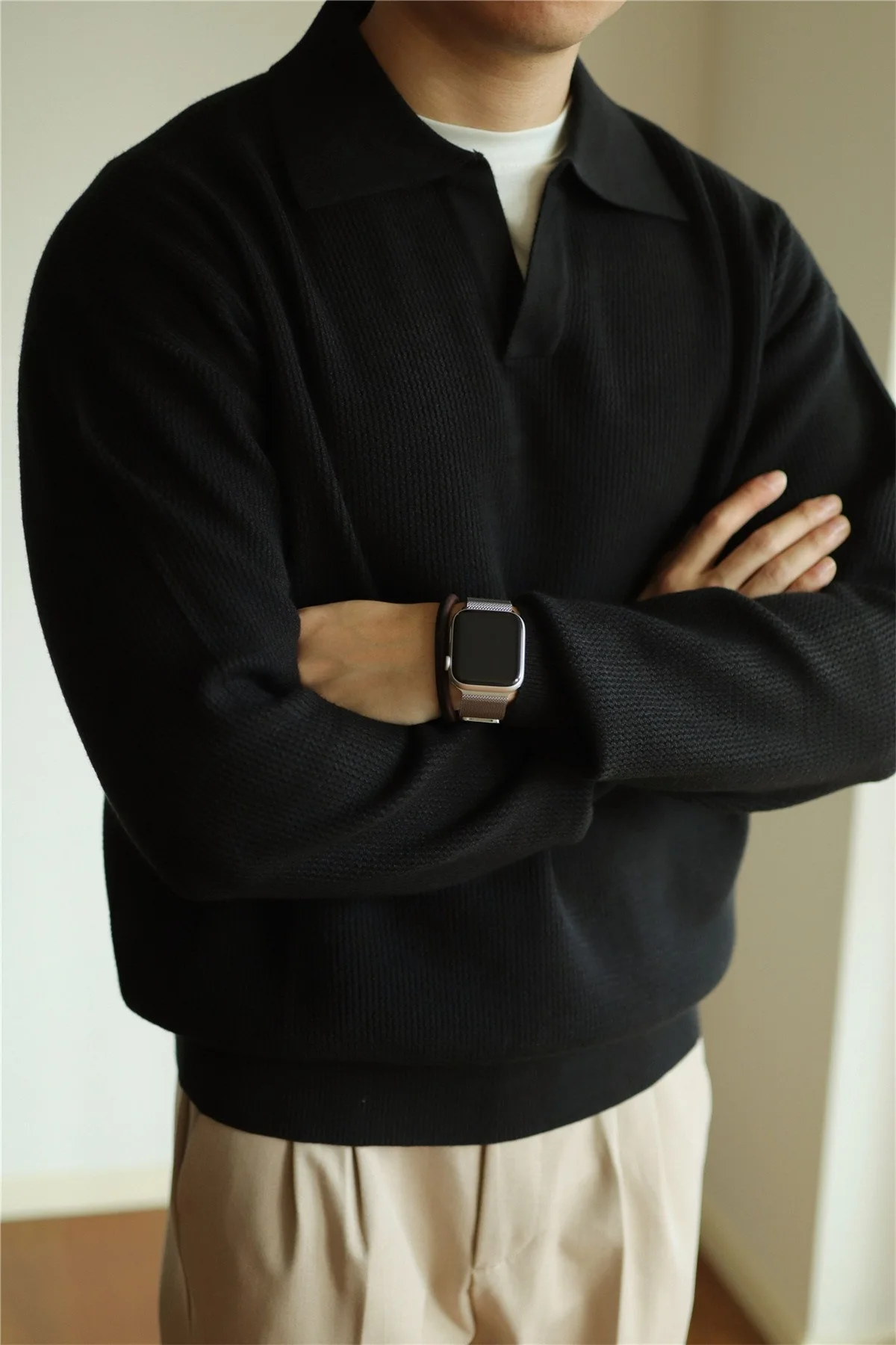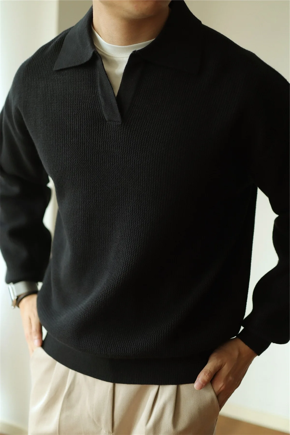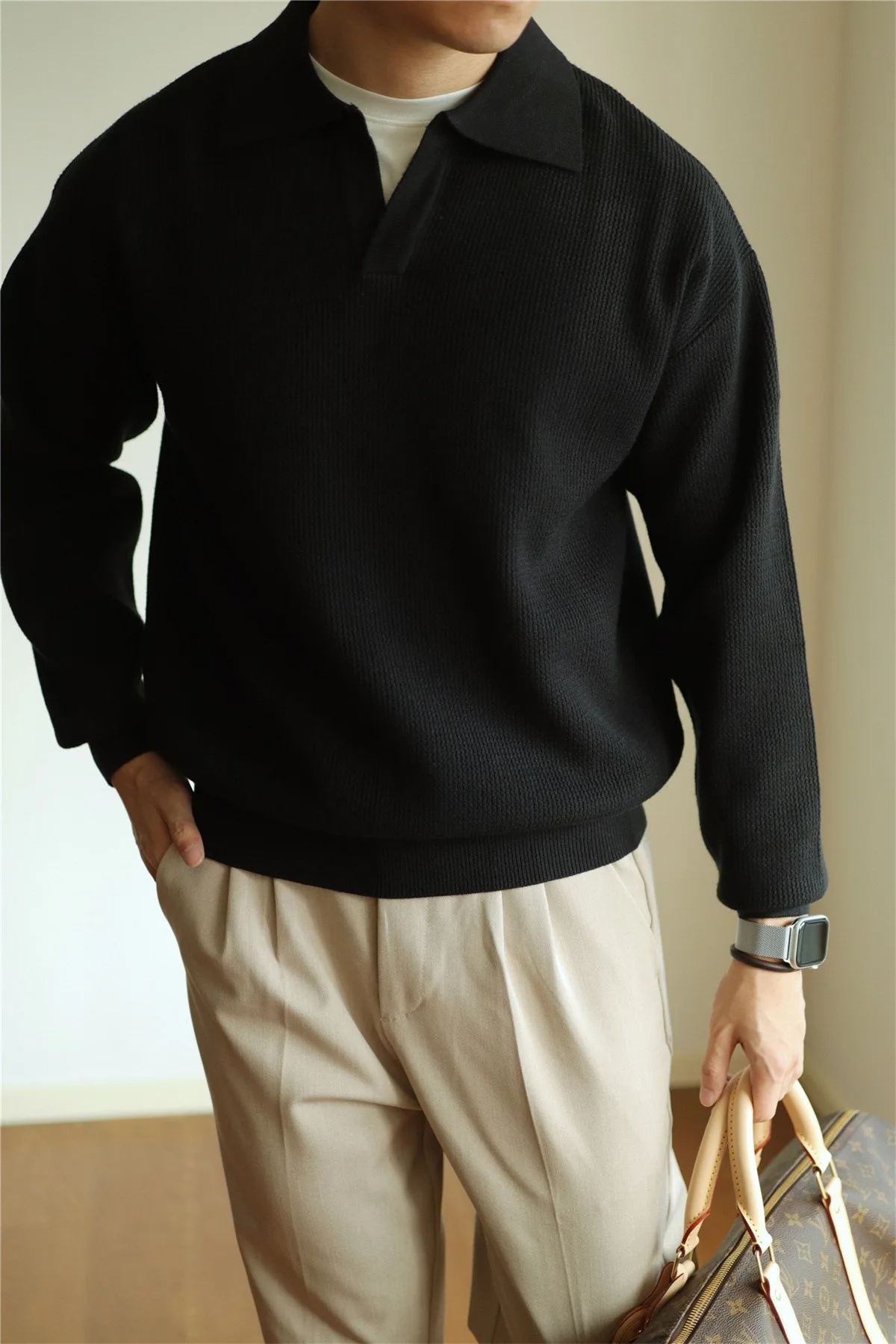 New American Chic Men Polo Sweater Luxury Trendy Business V Neck Knit Solid Color Pullover Leisure Slim-fit Long Sleeve Knitwear