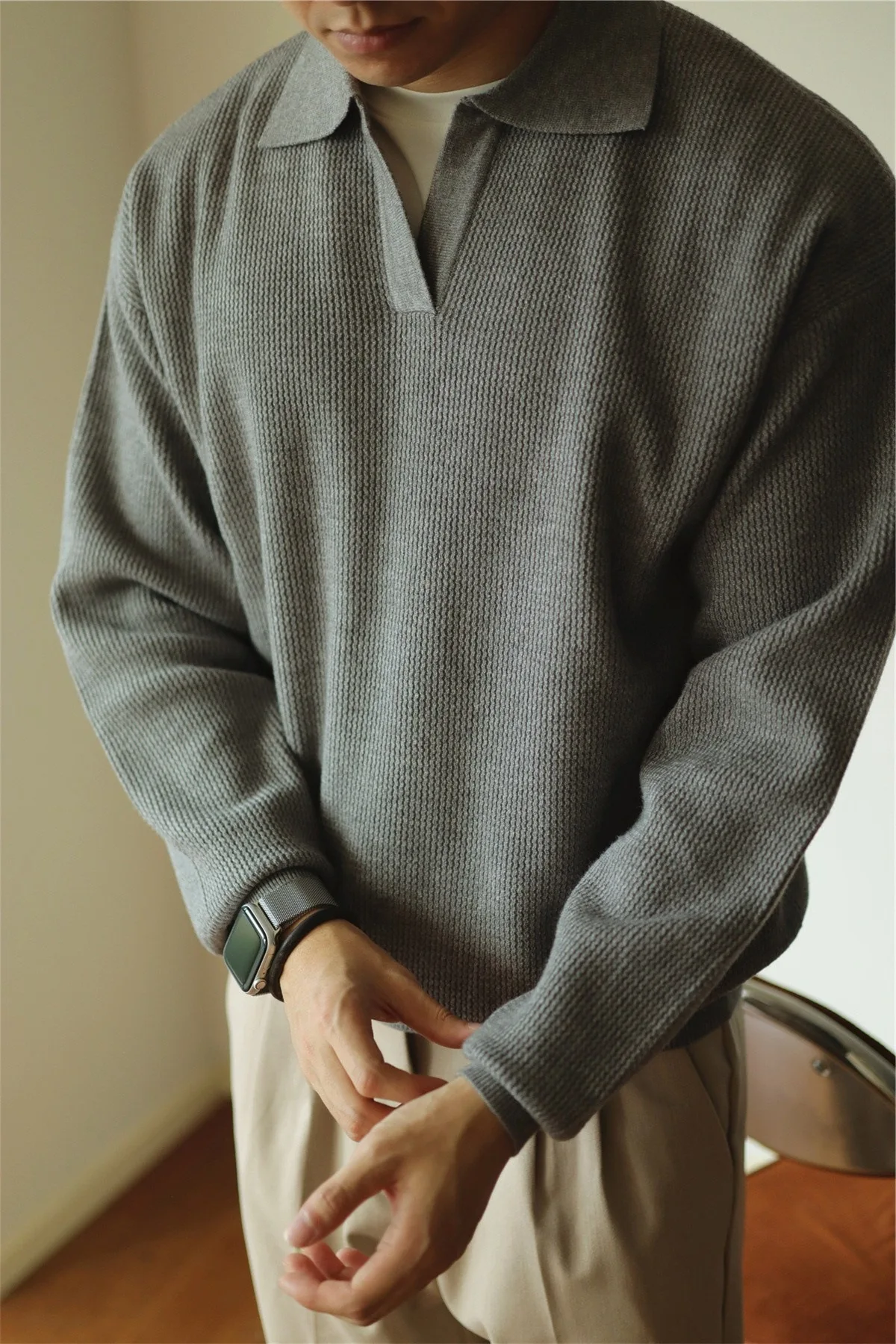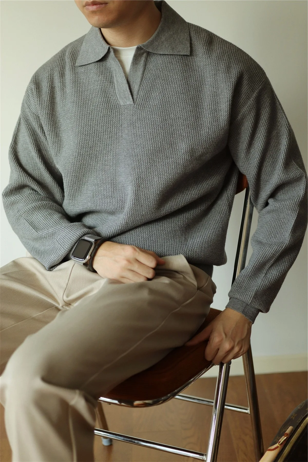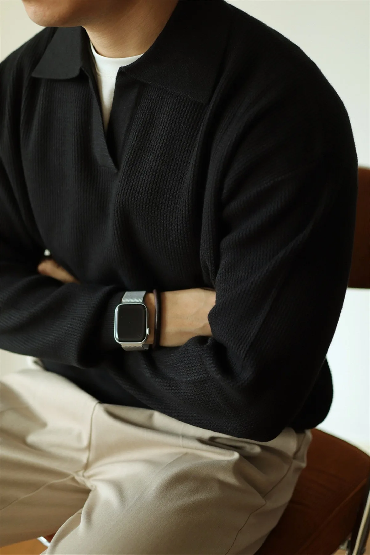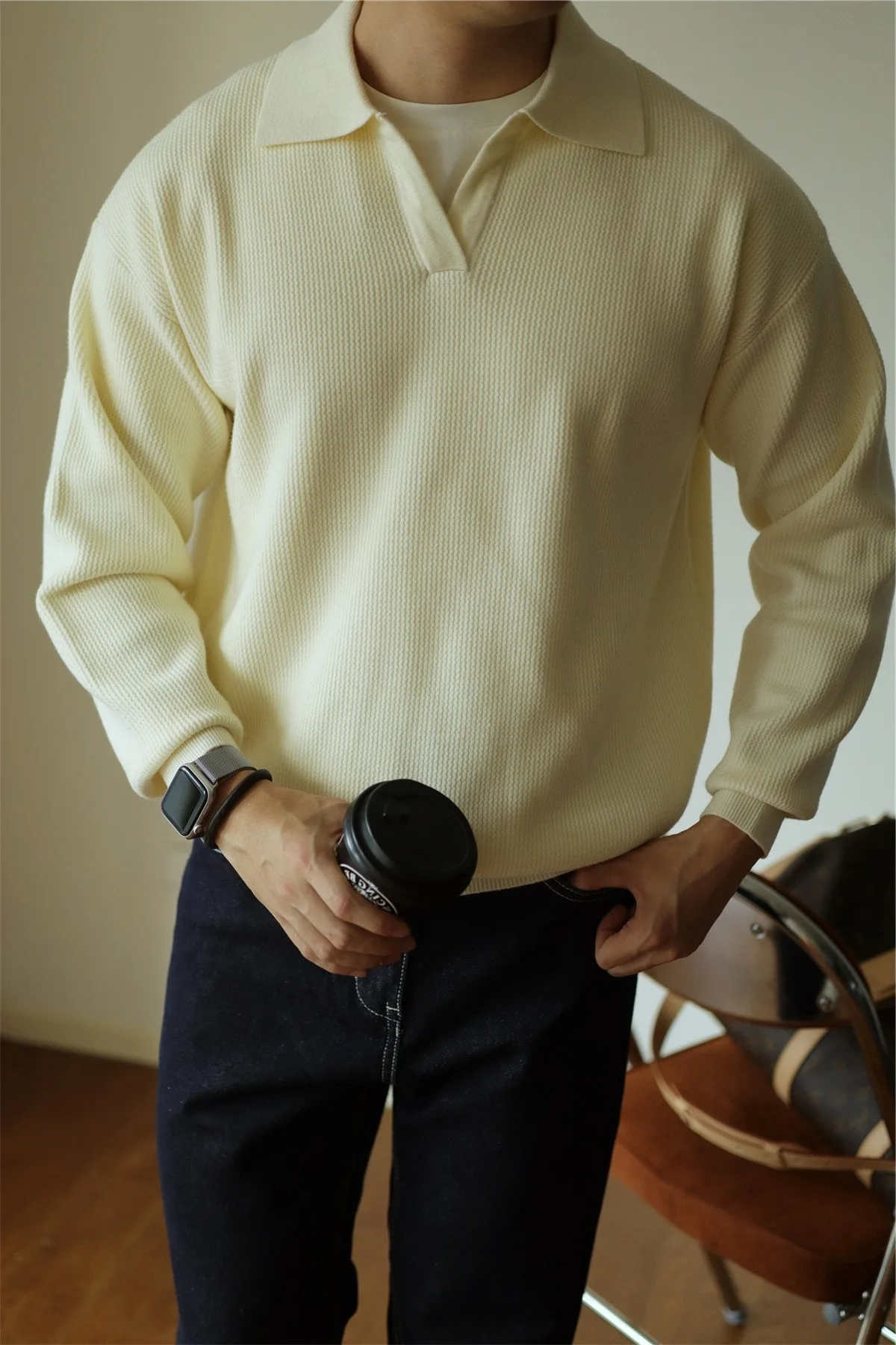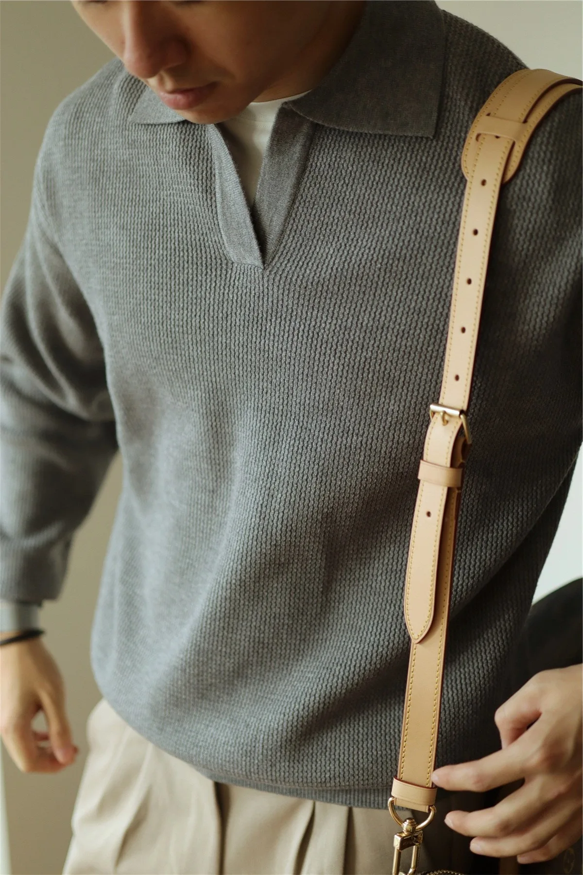 New American Chic Men Polo Sweater Luxury Trendy Business V Neck Knit Solid Color Pullover Leisure Slim-fit Long Sleeve Knitwear