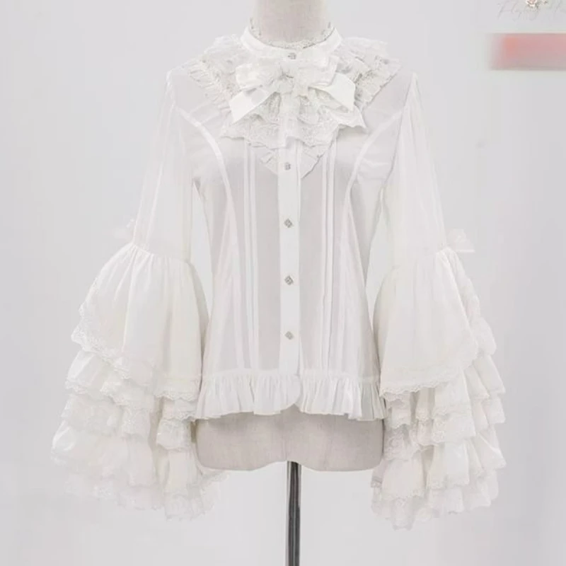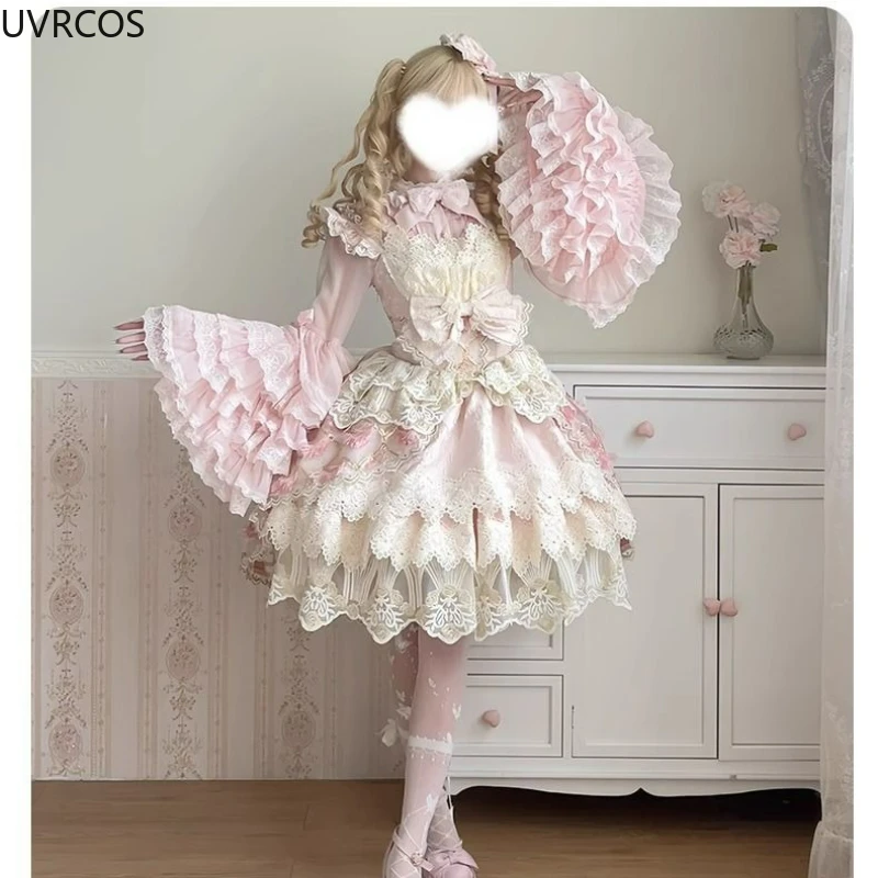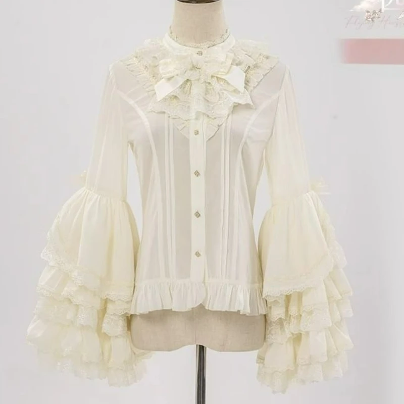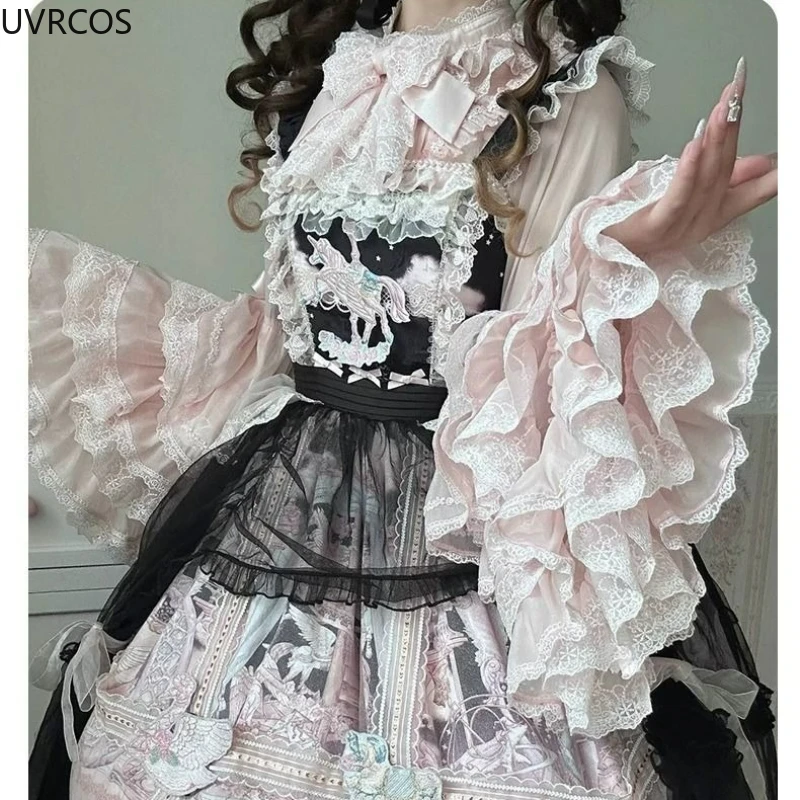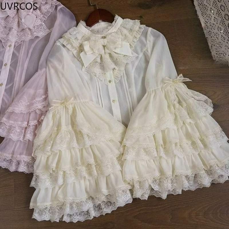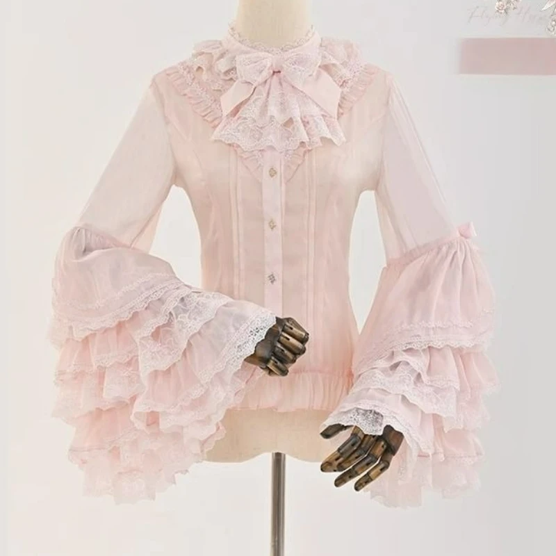 Pink Japan Lolita Flare Sleeve Sweet Bow Shirts Y2k Aesthetic Slash Neck Lace Patchwork Blouse Women Loose Grunge Ruffled Blusas