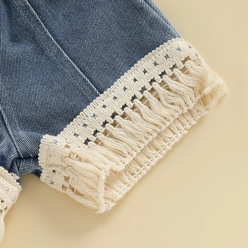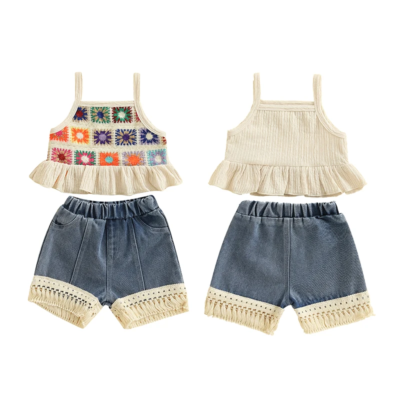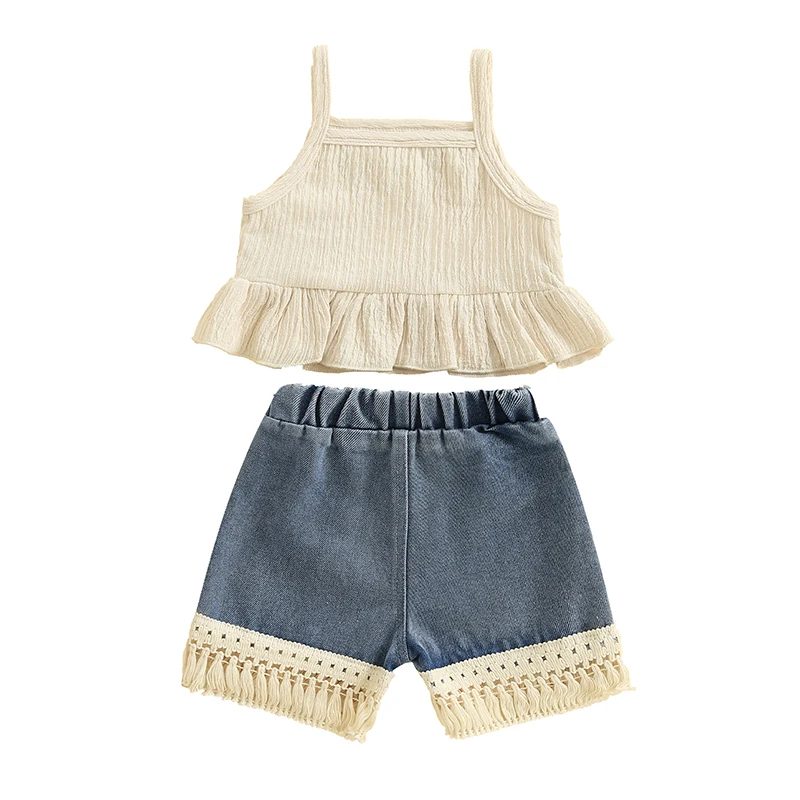 Kids Girls Shorts Set, Flowers Camisole with Tasseled Denim Shorts Summer 2-piece Outfit