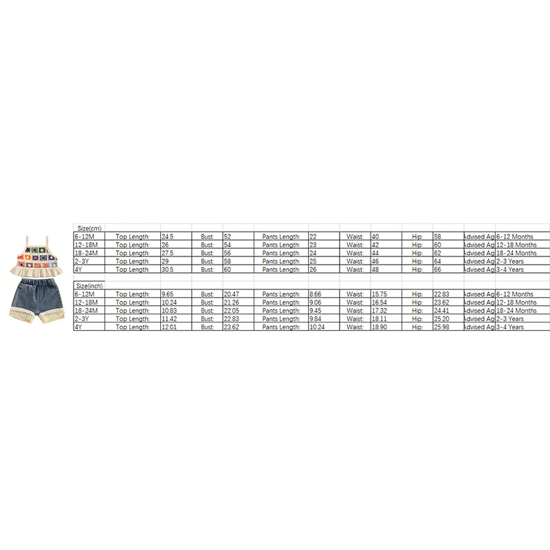 6-12M Top Length: 9.65 Bust: 20.47 Shorts Length: 8.66 Waist: 15.75 Hip: 22.83 Advised Age: 6-12 Months