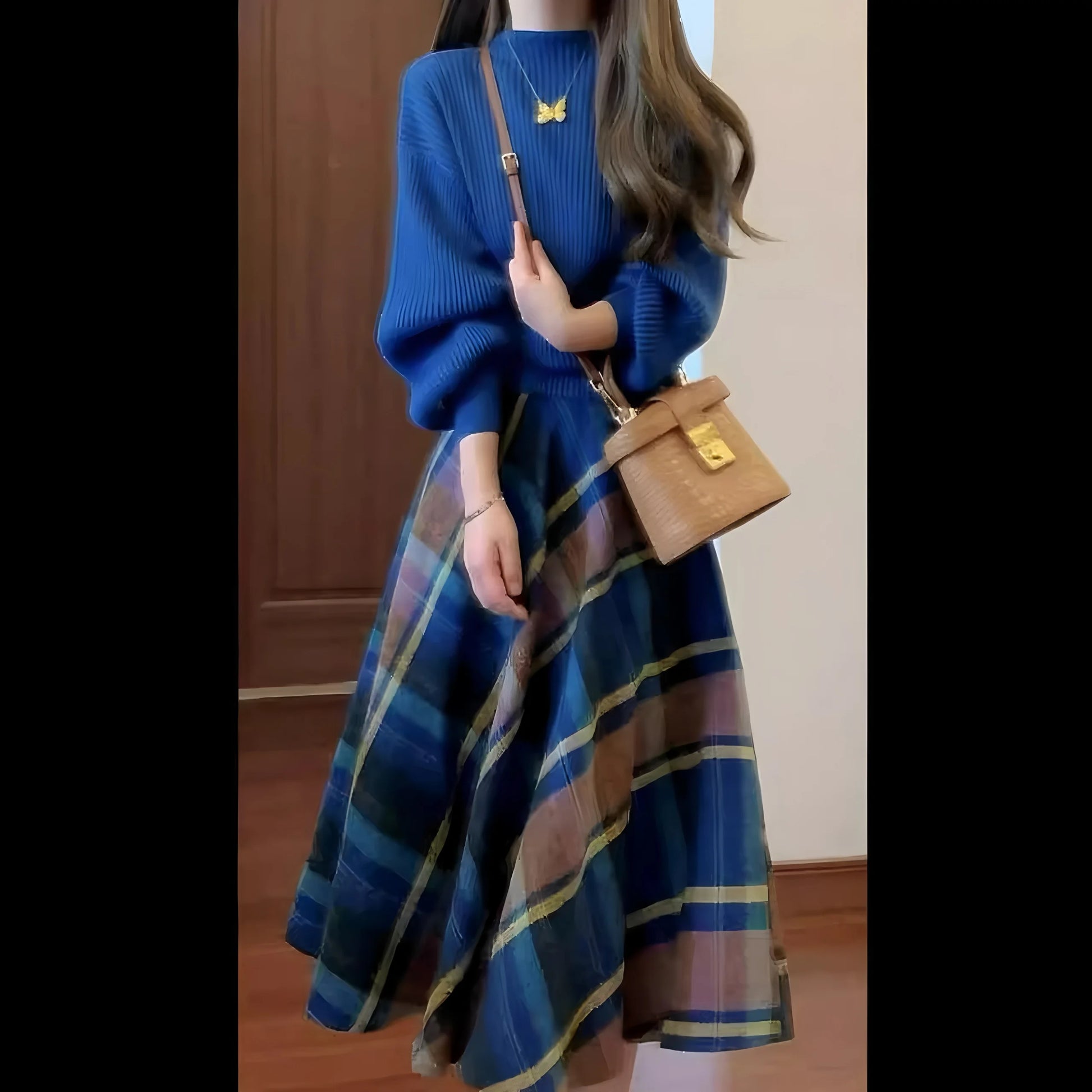 Spring and Autumn Women's American Retro Royal Blue Lantern Sleeve Knitted Sweater and Plaid Skirt Suit High Waist Umbrella Skirt Fashionable and Elegant Long Sleeve Pullover Commuting Suit