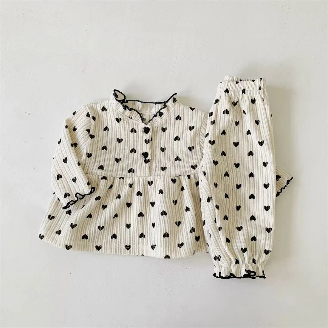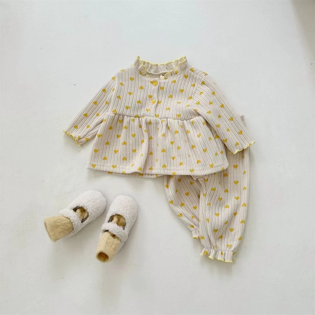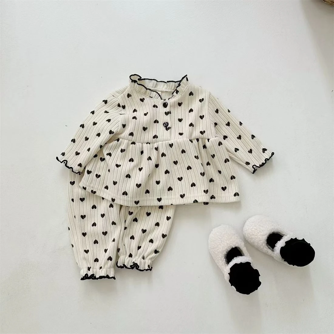 TZ2543 Korean Style Baby Casual Outfit with Heart Lace Trim Doll Shirt And Pants Spring Autumn Infant Clothing Two-Piece Set