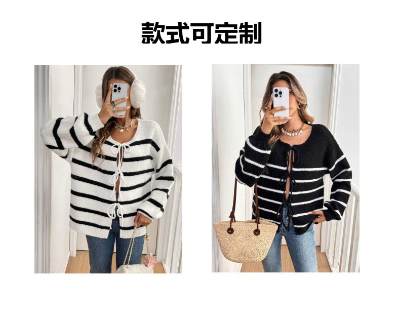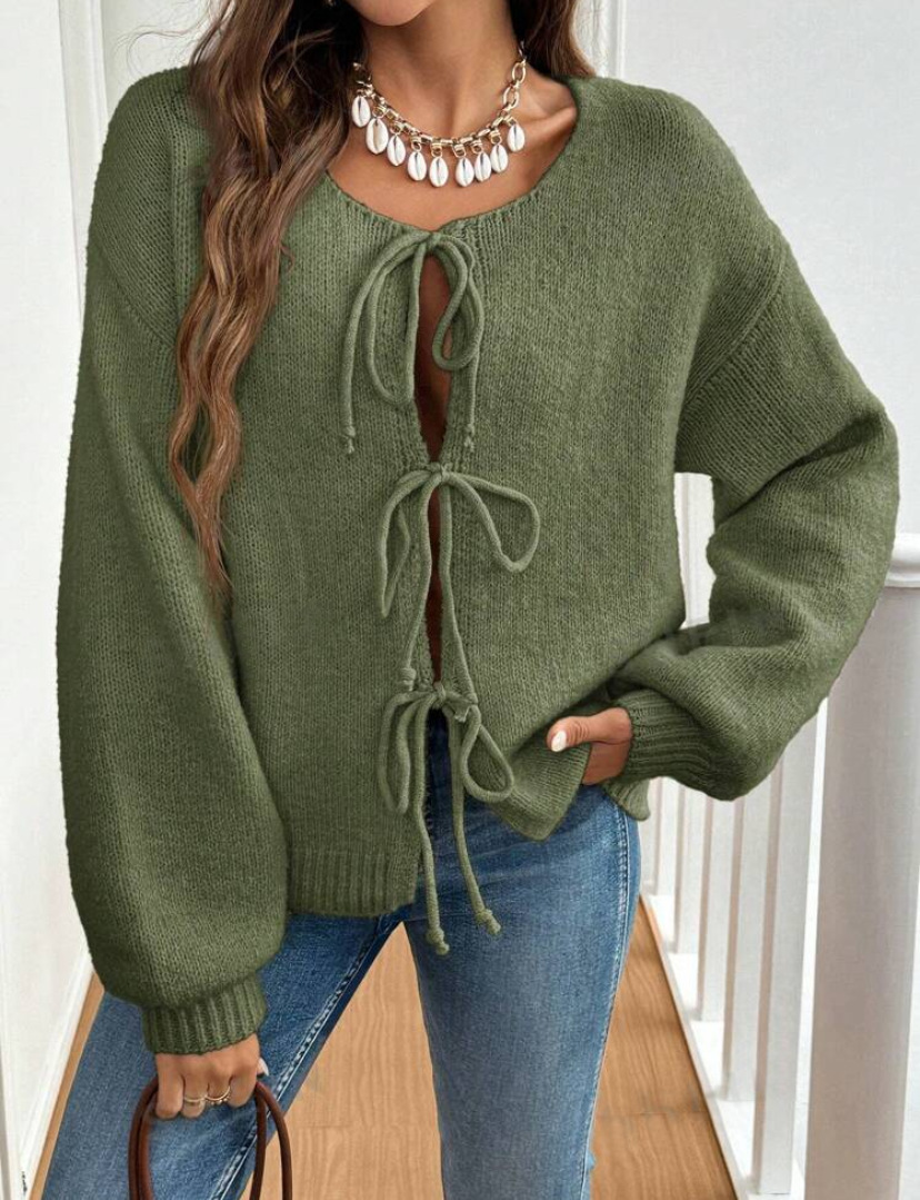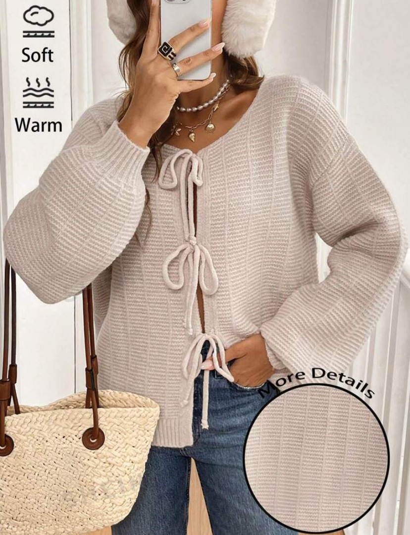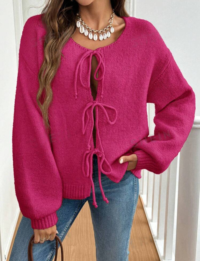 Women Solid Round Neck Lace Up Sweaters Cardigan Splice Knit Straight Jumpers Casual Long Sleeve Office Lady Autumn Winter